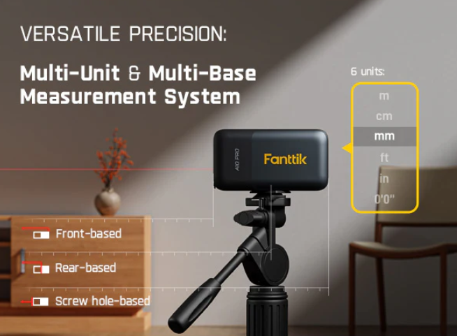 The A 10 Pro supports 6 units (Ft/Ft+in/in/M/CM/mm), 3 modes (distance/area/volume), and 3 reference points (front/rear/screw hole). Its tripod-compatible design ensures stable projection and high-altitude positioning, delivering precise measurements in corners, ceilings, and other complex scenarios with flexible operation
